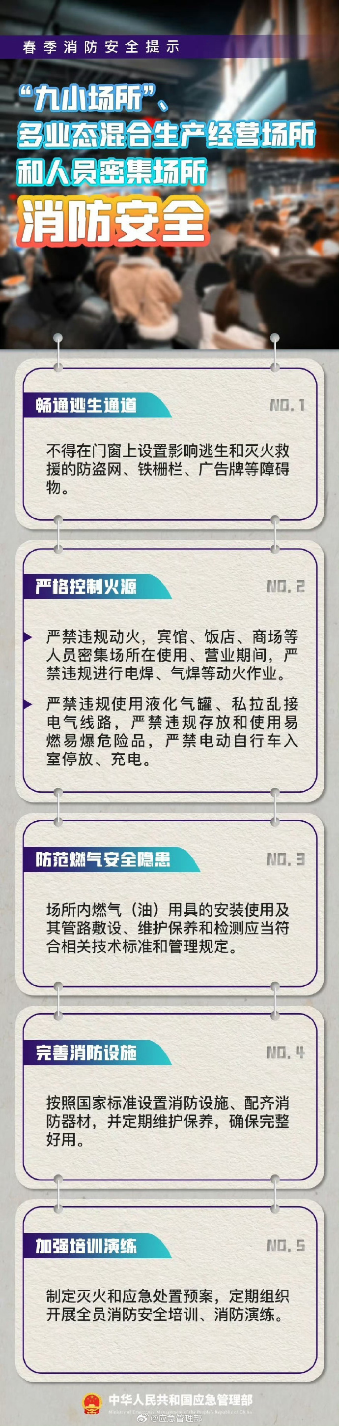 春季天干物燥,大風(fēng)天氣多,一個小火星就可能引起火災(zāi)。因此,在生活生產(chǎn)中,一定要注意防范安全隱患。 “九小場所”、多業(yè)態(tài)混合生產(chǎn)經(jīng)營場所、人員密集場所等要注意哪些事項?