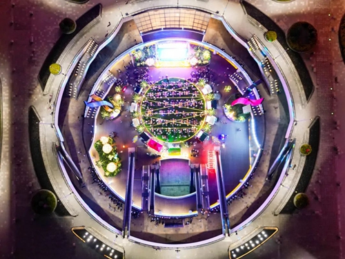 沿著(zhù)夜市往里走,抬頭便是夜間燈光交織出的燈光秀,兩側則有璀璨彩燈編織的“萬(wàn)千”星河。