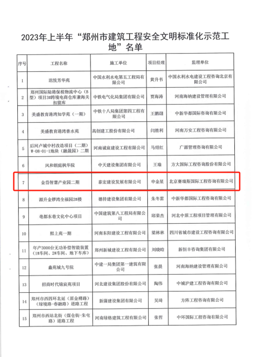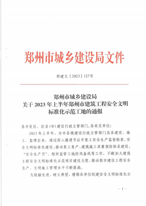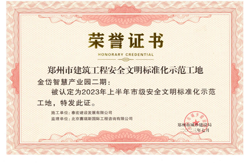 近日,經(jīng)鄭州市城鄉建設局評選,河南鄭地科創(chuàng )產(chǎn)業(yè)發(fā)展有限公司投資建設的金岱智慧產(chǎn)業(yè)園二期項目榮獲“2023年上半年鄭州市建筑工程安全文明標準化示范工地”榮譽(yù)稱(chēng)號。