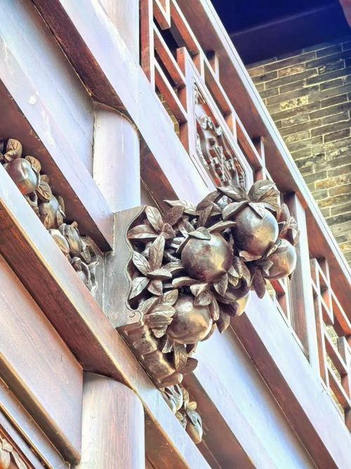 進(jìn)入北門(mén),首先映入眼簾的是16號樓,其主題為壽桃,主題來(lái)源于信陽(yáng)鄧穎超祖居,祖居繡樓內部裝飾有壽桃石雕,我們便選取此圖案進(jìn)行創(chuàng )作,在16號樓的墀頭、雀替、卡子花處均有精美的壽桃紋樣。