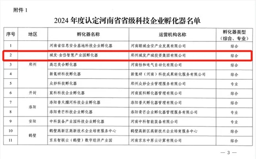 近日,河南省科學(xué)技術(shù)廳發(fā)布通知,公布2024年度河南省省級科技企業(yè)孵化器、河南省眾創(chuàng )空間的通知,經(jīng)推薦、專(zhuān)家評審、核查、廳長(cháng)辦公會(huì )研究、公示等程序,同意城發(fā)·金岱智慧產(chǎn)業(yè)園等21家單位認定為河南省省級科技企業(yè)孵化器,同意河南應用技術(shù)職業(yè)學(xué)院眾創(chuàng )空間等33家單位備案為河南省眾創(chuàng )空間。