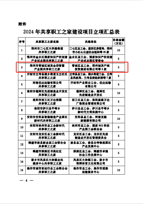 近日,河南省總工會(huì )發(fā)布《關(guān)于2024年共享職工之家建設項目立項的通知》,決定對城發(fā)金岱智慧產(chǎn)業(yè)園共享職工之家等32個(gè)共享職工之家建設項目進(jìn)行立項,并對城發(fā)金岱智慧產(chǎn)業(yè)園共享職工之家給予資金補助,鄭州市僅有三家職工之家獲得立項,這是城發(fā)金岱智慧產(chǎn)業(yè)園共享職工之家建設運營(yíng)后取得的第一份殊榮。