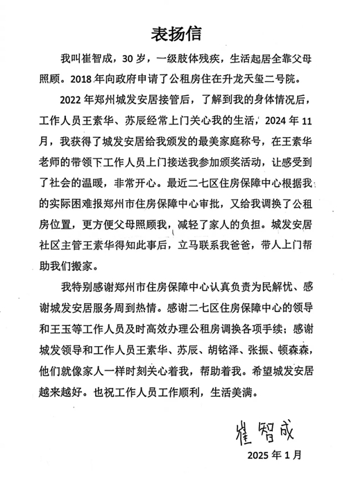1月9日清晨,崔老師一家分別向住保中心、城發(fā)安居贈送了錦旗,并送來(lái)一封表?yè)P信,對住保中心所展現的認真負責態(tài)度以及為民解憂(yōu)的卓越作風(fēng)表達了高度贊揚,同時(shí)也對城發(fā)安居工作給予了肯定鼓勵。